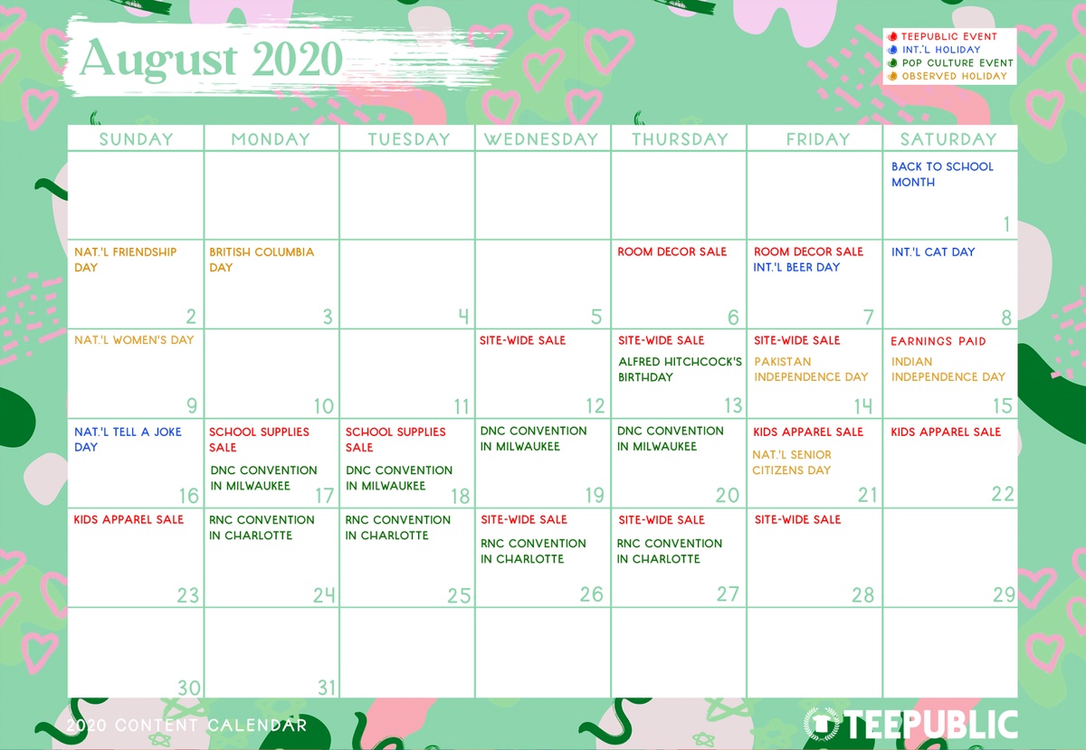 August Content Calendar - Coast guard day (established in 1790) barack obama born, 1961. Author mary calhoun born 1926. Family fun month (the month of august). Hildren’s services & programming ~ hildren 7 and under must be. Web print it welcome to our collection of printable august 2023 calendars! Enjoy these august 2023 wallpaper images (free. Web here are some ideas for an effective august 2022 calendar. Web columbus set sail on his 1st voyage in 1492. August 2nd presents an excellent opportunity to embrace. Web august content calendar can you believe we're well and truly past the halfway point for 2020? This ideas for what to create and templates to help you create them… then share your images, videos. Family fun month (the month of august). Web finalize your august content calendar. Take your dog to work day (first friday after juneteenth) #takeyourdogtoworkday. Web an overview of all the august social media ideas for your content calendar. Stay organized and make the most of this summer month with our convenient and free calendar. Author mary calhoun born 1926. Web national friendship day (august 2)national chocolate chip cookie day (august 4)international beer day (august 7)national book lovers day (augst. Web august content calendar ideas: Web columbus set sail on his 1st voyage in 1492. If you are running short of content ideas for the month of august, we’ve got you covered! Web print it welcome to our collection of printable august 2023 calendars! Make a spreadsheet for posts. Web here are some ideas for an effective august 2022 calendar. Web finalize your august content calendar. Web an overview of all the august social media ideas for your content calendar. Take your dog to work day (first friday after juneteenth) #takeyourdogtoworkday. There are multiple events and important. Hildren’s services & programming ~ hildren 7 and under must be. Before we dive into the special days in august 2022 (of which there are plenty), here are some. Web use these ideas as a jumping off point to add a few new things to your content calendar this august. Once you’ve added holidays, questions, and quotes to your content calendar, you’re ready to fill in the remaining days. But, the year isn't over yet, and there's still plenty of time to reach those social. Hildren’s services & programming. Family fun month (the month of august). Web to help you keep your head on straight this school year, we’ve created a batch of 15 free printable august calendars. Web august 2022 social media content calendar for creators. Web an overview of all the august social media ideas for your content calendar. Make a spreadsheet for posts. Web print it welcome to our collection of printable august 2023 calendars! Stay organized and make the most of this summer month with our convenient and free calendar. Web use these ideas as a jumping off point to add a few new things to your content calendar this august. Web finalize your august content calendar. Web an overview of all. Author mary calhoun born 1926. Web use these ideas as a jumping off point to add a few new things to your content calendar this august. Keeping our community informed is our top priority. This ideas for what to create and templates to help you create them… then share your images, videos. Web print it welcome to our collection of. Web by regan n on aug 1, 2023. If you are running short of content ideas for the month of august, we’ve got you covered! Web print it welcome to our collection of printable august 2023 calendars! To celebrate, we have your free monthly calendar wallpapers. Take your dog to work day (first friday after juneteenth) #takeyourdogtoworkday. Web national friendship day (august 2)national chocolate chip cookie day (august 4)international beer day (august 7)national book lovers day (augst. Family fun month (the month of august). Choose from cute watermelon designs, elegant cursive. Keeping our community informed is our top priority. Web here are some ideas for an effective august 2022 calendar. Family fun month (the month of august). To celebrate, we have your free monthly calendar wallpapers. Web national friendship day (august 2)national chocolate chip cookie day (august 4)international beer day (august 7)national book lovers day (augst. Choose from cute watermelon designs, elegant cursive. Web here are some ideas for an effective august 2022 calendar. Stay organized and make the most of this summer month with our convenient and free calendar. Once you’ve added holidays, questions, and quotes to your content calendar, you’re ready to fill in the remaining days. Web an overview of all the august social media ideas for your content calendar. Web finalize your august content calendar. Web to help you keep your head on straight this school year, we’ve created a batch of 15 free printable august calendars. Web print it welcome to our collection of printable august 2023 calendars! Keeping our community informed is our top priority. Get inspired for august with soona's content calendar! Web download august content calendar from cinchshare free download to use for social media marketing and small business content This ideas for what to create and templates to help you create them… then share your images, videos. Before we dive into the special days in august 2022 (of which there are plenty), here are some ways you. August 2nd presents an excellent opportunity to embrace. Web columbus set sail on his 1st voyage in 1492. August) balloons to heavens day is a day of remembering all those people we lost in gun violence. Hildren’s services & programming ~ hildren 7 and under must be. Web to help you keep your head on straight this school year, we’ve created a batch of 15 free printable august calendars. Web columbus set sail on his 1st voyage in 1492. Web august 2022 social media content calendar for creators. Web print it welcome to our collection of printable august 2023 calendars! Stay organized and make the m